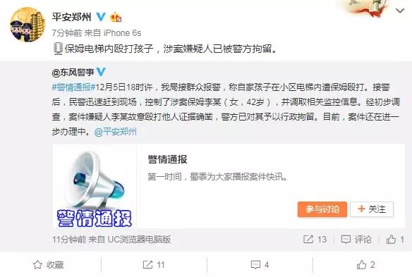 9日晚8時左右,鄭州東風路派出所官方微博發佈通報稱,12月5日18時許,我局接羣眾報警,稱自家孩子在小區電梯內遭保姆毆打。接警後,民警迅速趕到現場,控制了涉案保姆李某(女,42歲),並調取相關監控信息。經初步調查,案件嫌疑人李某故意毆打他人證據確鑿,警方已對其予以行政拘留。