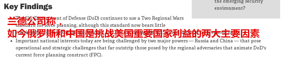蘭德公司在調查報告中稱,如今俄羅斯和中國是挑戰美國重要國家利益的兩大主要因素。中俄兩國的潛力大大增加,在特定情況下,美國或在戰爭中敗給這兩個強勁對手。