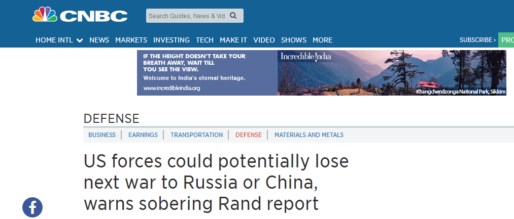 美國CNBC12月10日報道以“美國可能在潛在的下一場戰爭中輸給中國或俄羅斯”為題稱,題為《美國在危險世界的軍事能力和力量》的報告出爐於美朝關係緊張增加之際,同時其在報告也討論了北約與俄羅斯爆發衝突以及波羅的海國家捲入的場景,以及在現有美軍武裝力量情況下與中國在台灣問題上“爆發衝突”的情況。