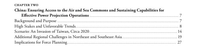 環球網記者發現,在該報告所涵蓋的7個章節中,中俄佔了兩個章節,且均單列為一章,在長達190頁的報告中,涉及中國的部分就有20頁,其中又有5頁以題為“場景:‘侵入’台灣,大約在2020年”為題專門談論了台灣問題。