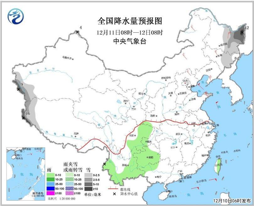 11日08時至12日08時,東北地區東部、山東半島北部、新疆西南部山區、西藏西南部等地有小到中雪,其中黑龍江東北部、西藏西南部局地有大到暴雪;四川盆地東部、貴州大部、雲南中南部、台灣東部等地有小雨或陣雨;內蒙古中東部、東北地區大部、華北中北部、黃淮東部、江淮東部等地有4~6級風,巴士海峽、南海東北部部分海域風力可達8級、陣風9級(見圖2)。