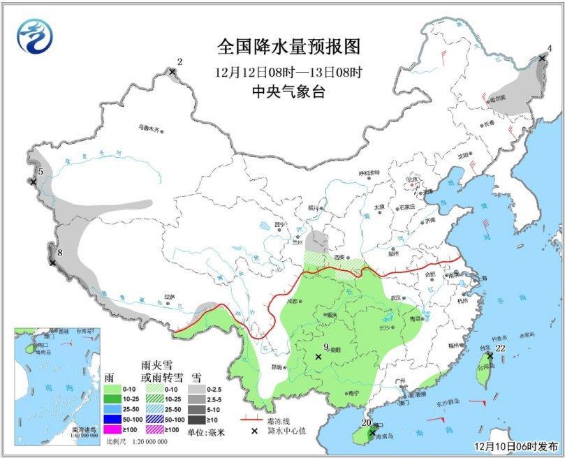 12日08時至13日08時,黑龍江東部、新疆西南部山區、西藏西南部、甘肅東南部、陝西南部等地有小到中雪或雨夾雪,其中西藏西南部局地有大雪;西南地區東部、江漢西部和南部、江南西部、華南西部、雲南西部和東部、海南島、台灣等地有小雨或陣雨,局地中雨;內蒙古東部、東北地區大部等地有4~6級風,台灣海峽及南海東北部部分海域的風力可達8級、陣風9級(見圖3)。