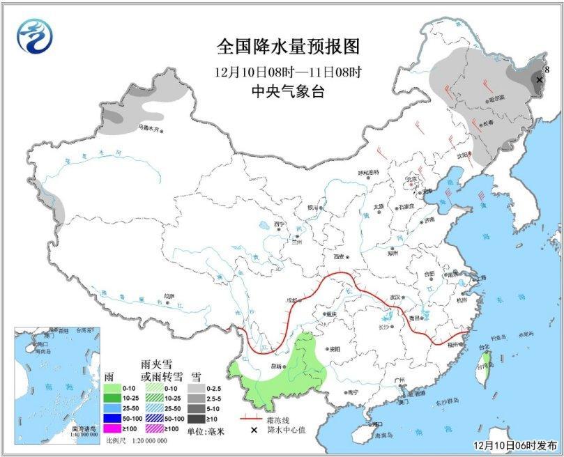 10日08時至11日08時,黑龍江大部、吉林中東部、山東半島北部、新疆西部等地有小到中雪,其中黑龍江東北部局地有大雪(5~8mm);貴州西部、雲南南部等地有小雨或陣雨;內蒙古中東部、東北地區、華北東部、黃淮東部、江淮東部等地有4~6級風,黃海東北部部分海域風力可達8級、陣風9級(見圖1)。