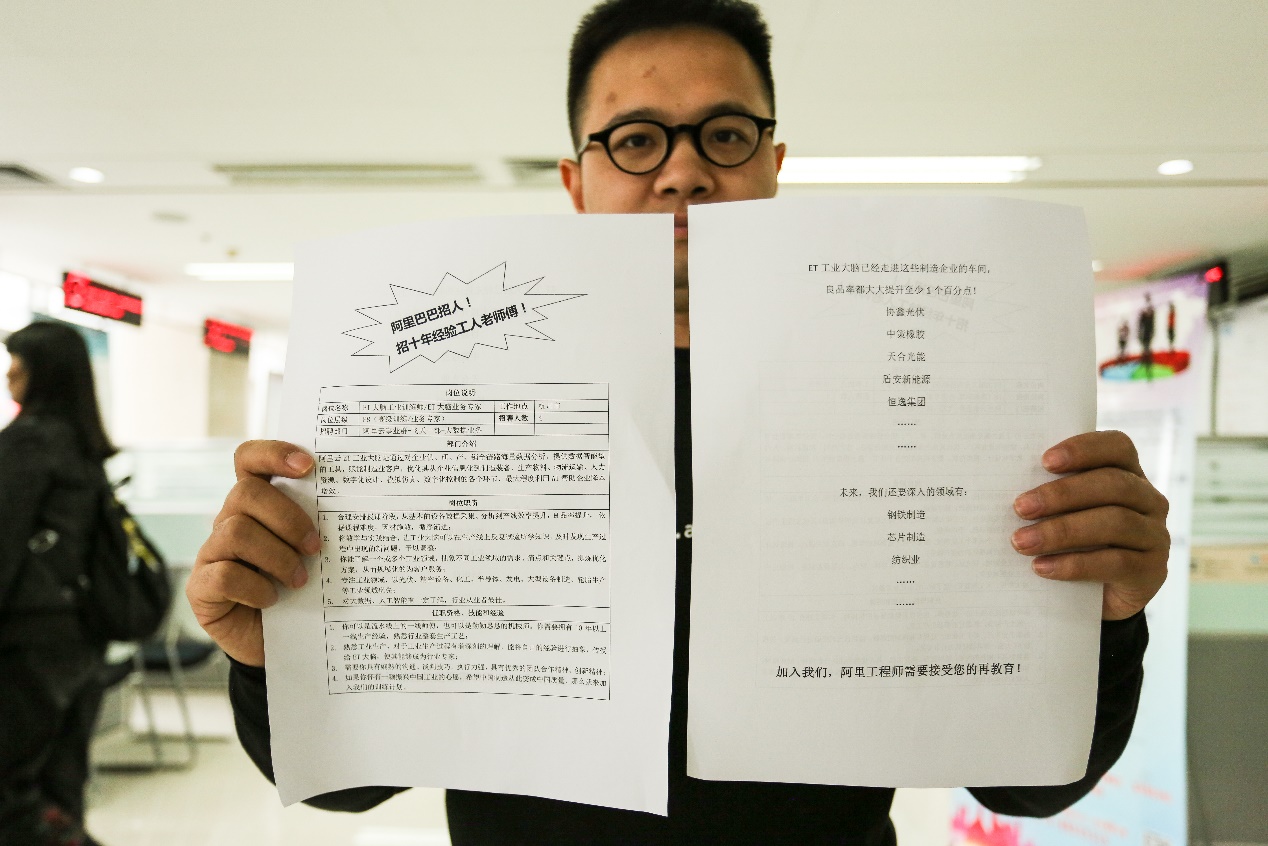 阿里巴巴要招聘工人師傅入職?現場的應聘者都非常好奇,連其他招聘企業的工作人員也頻頻走到阿里的招聘位前,聽聽情況。