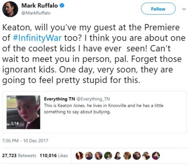 (Mark Ruffalo還邀請這位小男孩去參加《復仇者聯盟:無限戰爭》的首映式,並讓他不要理會那些欺凌他的壞孩子)