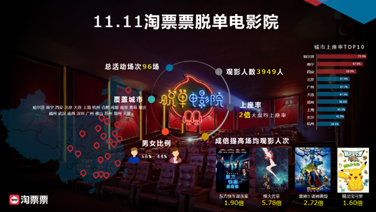 今年下半年,淘票票已經做出了諸多嘗試。圍繞“同好+社交+情感”打造的脱單電影院,在雙十一脱單場開了96場,平均上座率36.71%,是大盤平均上座率的兩倍,哈爾濱脱單場上座率高達73.5%。同期,小聚場開創了C2B的觀影新模式,147場平均上座率44.5%。