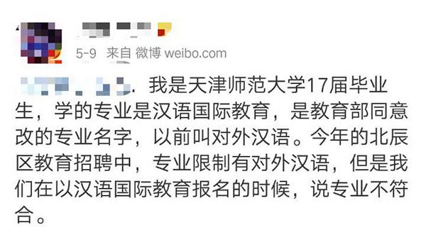 天津師範大學2017屆畢業生羅曼(化名)跟王芬的遭遇恰恰相反——作為“漢語國際教育”專業畢業生,她在2017年天津市北辰區一次教師招聘中,因為招考單位專業要求中包含“對外漢語”而非“漢語國際教育”,最終應聘失敗。