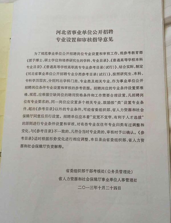 上述工作人員表示,本次招考專業目錄是參照由河北省委組織部幹部考核處和河北省人社廳聯合印發的《河北省事業單位公開招聘專業分類參考目錄(試行)》(以下簡稱“河北參考目錄”)來制定。“不管是應屆還是往屆的,只要畢業證上(專業名稱)符合條件的都可以報考,河北省出的小冊子(即《河北參考目錄》)裏面有‘漢語國際’和‘對外漢語’,用人單位沒有選擇‘對外漢語’,只選擇了‘漢語國際教育’。”