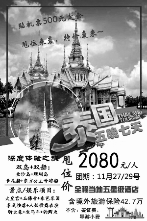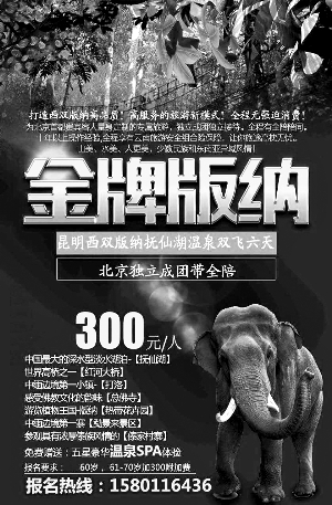 記者來到位於青年路一處老舊小區的北京金色陽光旅行社,諮詢為父母報名旅行團,工作人員立即拿出手機,將其中幾條線路海報電子版給記者看,其中一張是去泰國的,“現在去泰國天氣暖和,老人們都喜歡。年底我們大促銷,原價都是3000多,現在只要2000元。”此外,對方還拿出來一張去西雙版納的旅行宣傳冊,上面寫着“雙飛6天僅需300元”。銷售人員告訴記者,這個團價格便宜十分緊俏,但是需要至少5人一同報名才能享受這個價格,但當記者提出要和老人同行後,卻遭到了工作人員的拒絕。“這個團是我們專門為老人打造的,要求60歲以上的老人才能參加。”當記者詢問是否有自費項目或者是否保證出團時,工作人員又顧左右而言他:“這個機會十分緊俏,您要是給老人報名要儘快。”