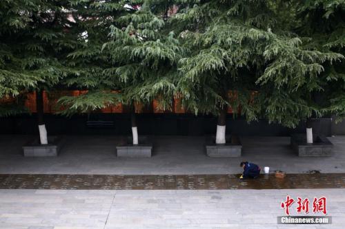 12月7日,侵華日軍南京大屠殺遇難同胞紀念館內的工作人員擦拭倖存者腳印銅板路。中新社記者 泱波 攝