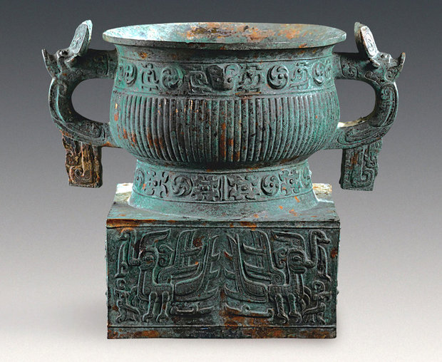 青銅鍋上刻有龍、鳥圖案,表面飾有192個尖釘,手柄處還有24個牛頭點綴。墓內還發現了兩隻形似鹿狀的酒杯,專家鑑定這兩隻酒杯可能被用於宗教活動與殯葬儀式中。另外還發現了一隻四耳湯碗。少數器皿上還刻有商朝不同氏族名字的銘文。考古學家稱,這些東西很可能是戰利品,因為周王征服商王后,俘獲了不少青銅器皿,後將戰利品分發給了下屬軍官。