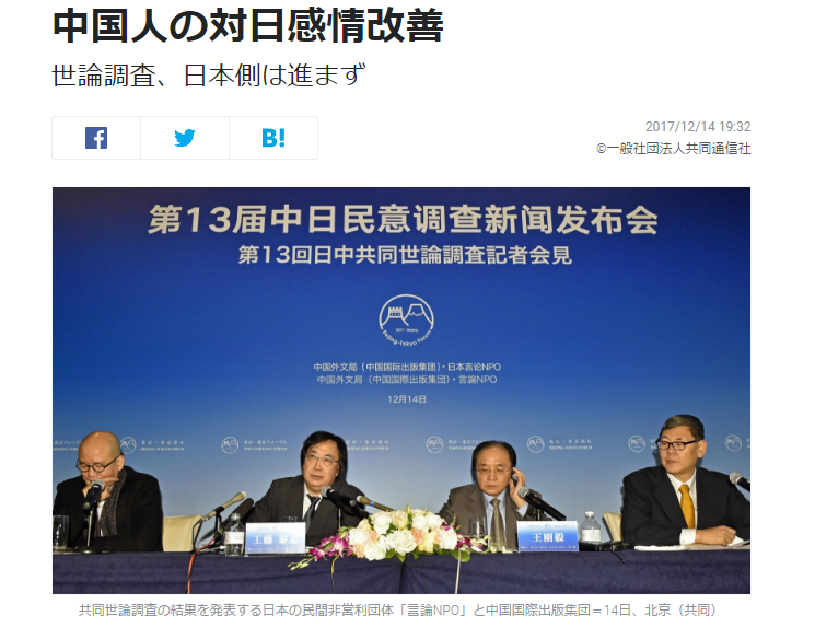 【環球網報道 記者 餘鵬飛】據日本ANN電視台12月14日報道,日本民間團體“言論NPO”和中國國際出版集團聯合進行了一項民意調查。結果顯示,中國民眾對日好感度大幅增加,日本對華好感度增長不大。
