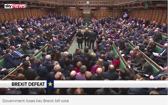 當地時間13日晚,英國下議院就“退出歐盟法案”的修正案進行投票表決,持政府立場、反對修正案的保守黨議員以305對309的4票之差,輸掉投票結果。這是特蕾莎⋅梅成為首相以來的第一次重大立法失敗。英國反對黨工黨領袖科爾賓(Jeremy Corbyn)表示,這一投票結果是首相特蕾莎⋅梅及其政府“丟臉的失敗”。輿論認為,這意味着英國議會取代政府實際擁有了對“脱歐”談判的決定權,政府在“脱歐”談判中被“束縛了手腳”。英國政府則在一份聲明中説,對下議院通過這一修正案感到失望。