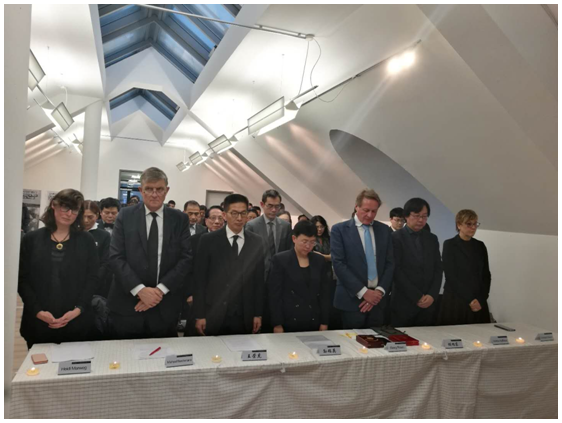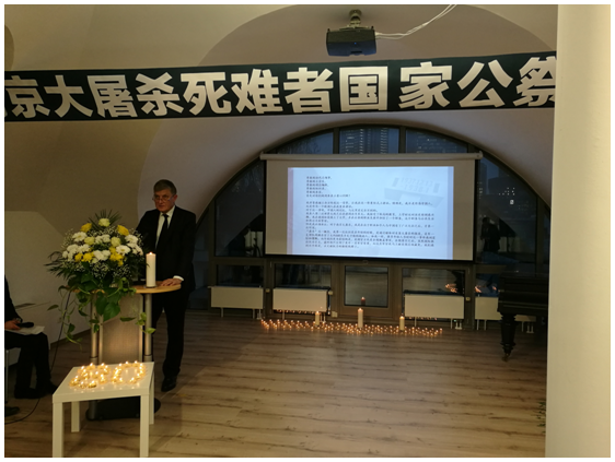 【環球時報駐德國特約記者 烏蘭】歐洲時間12月13日下午,南京大屠殺80週年公祭儀式大會暨“南京大屠殺文物、史料證人證言大型圖片展”在《歐洲時報》法蘭克福文化中心舉行。這一天是第四個南京大屠殺死難者國家公祭日,中國駐法蘭克福代總領事孫瑞英,曾與拉貝先生一起參加營救、時任德國駐南京大使館秘書的喬治·羅森先生的孫子小喬治·羅森一家,德國黑森州政府歐洲及國際事務司前司長、中國國際投資促進中心(德國)特聘顧問博喜文博士和60多個僑團、近200餘名華人華僑及德國友好人士參加了此次在法蘭克福的公祭儀式,為80年前在南京遇難的中國同胞低頭默哀。