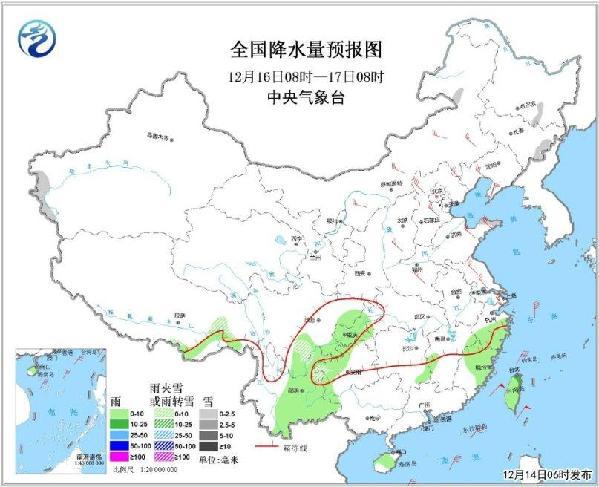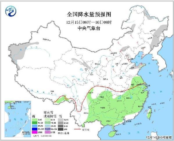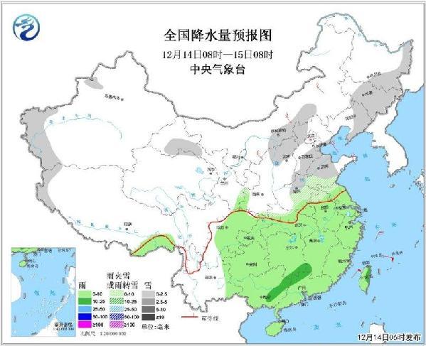 14日至15日,華北、黃淮、東北等地有小雪或雨夾雪,雨雪分界線位於秦嶺至淮河一線。此外,西南地區東部、江漢、江淮、江南和華南等地有小雨,局地中雨。