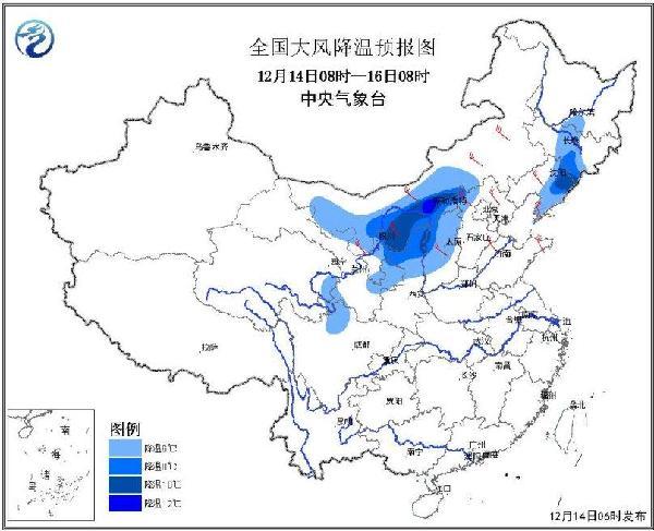 受較強冷空氣影響,14日至17日我國中東部大部地區自西向東自北向南將先後出現大範圍大風降温天氣,平均氣温普遍下降4~8℃,內蒙古中部偏南地區、陝西北部、吉林東部、遼寧東部等地局地降温幅度可達10℃以上。18日凌晨,日最低氣温0℃線將位於湖南中南部、江西中南部到福建中部一帶。其中, 14日08時至16日08時,內蒙古中西部、華北西部、西北地區東北部、吉林中部、遼寧東部等地將有6~8℃降温,內蒙古中部偏南地區、陝西北部、遼寧東北部等地降温可達10℃以上,上述大部地區有4~6級風(見圖1)。中央氣象台12月14日06時發佈大風降温預報。