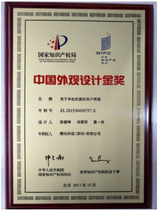 12月13日下午,第十九屆中國專利獎頒獎大會在北京召開。本屆中國專利獎共評選出中國專利金獎20項,中國外觀設計金獎5項,中國專利優秀獎804項,中國外觀設計優秀獎68項。騰訊科技(深圳)有限公司(以下簡稱“騰訊公司”)的一項外觀設計專利“用於手機的圖形用户界面”(專利號:ZL201530430757.X)獲得第十九屆中國外觀設計金獎。