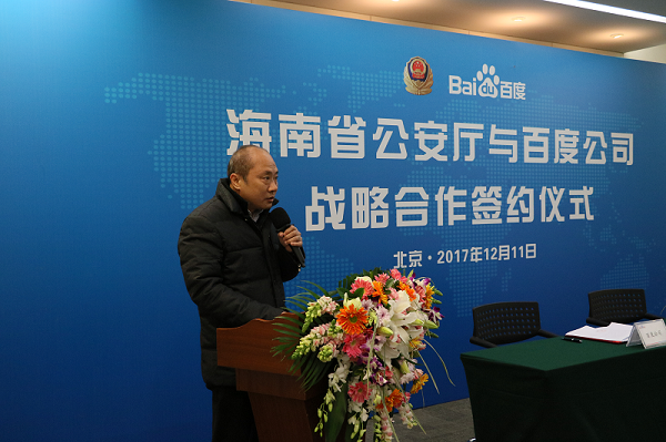 為利用先進技術手段嚴厲打擊各類違法犯罪活動,12月11日,海南省公安廳與百度達成戰略合作,雙方將合作開展打擊各類違法犯罪犯罪的技術研究,將警務工作與互聯網大數據技術、人工智能能力深度結合,並且共同打擊網絡黑產。海南省公安廳刑警總隊總隊長朱洪山、副總隊長張波、支隊長陳漢榮、百度安全事業部總經理馬傑、百度執行總編輯劉敏、百度大數據部副總經理劉立萍、百度地圖智慧交通總經理嚴孫榮等出席了本次合作簽約儀式。