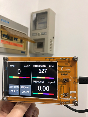 繼續換檢測儀到另外一個角落測試,PM 2.5 顯示為 0 。同時,室內二氧化碳的濃度也被大大降低。
