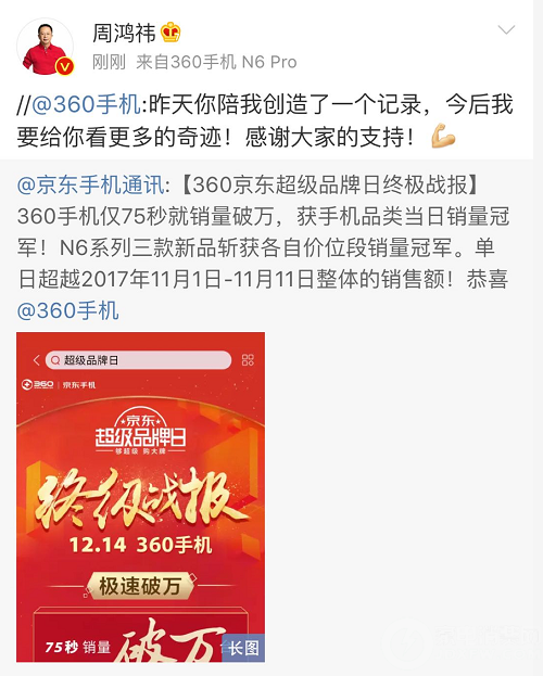 針對該成績,12月15日,360公司董事長周鴻禕也在其微博中默默點贊,雖然沒有評價和鼓勵,但依然表現出了對360手機取得好成績的讚許。