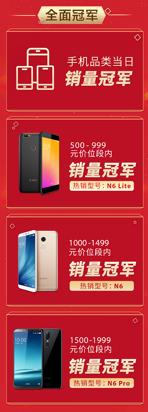 據瞭解,360手機此次主打的3大N6系機型表現優異,在不同價位段碾壓羣雄,最終奪得四項銷量冠軍,其中在超品日剛剛開始75秒即銷量破萬台、手機品類當日銷量第一、360N6 Lite/360N6/360N6Pro三款機型分別取得500-999元、1000-1499元、1500-1999元銷量冠軍、單日超越2017年雙11整體銷售額等。