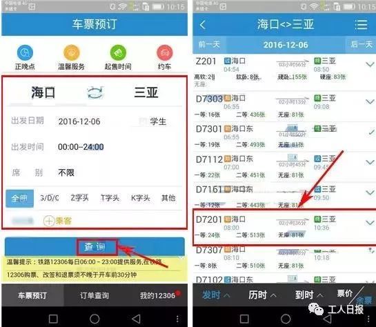 1、點開鐵路12306手機客户端,首先在“車票預訂”界面完成始發地與終點站、出發時間與乘客信息,點擊【查詢】,然後選擇所要搭乘的列車班次;