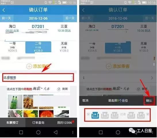 2、然後在選擇好軟硬卧坐席後點擊界面中的【選座服務】,隨後選擇相應的靠窗座位,點擊【確認】;