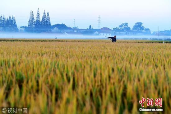 2017年10月31日,江蘇海安,晨霧給秋收稻田披戴上“面紗”。早起的農民在阡陌間忙碌。 圖片來源:視覺中國
