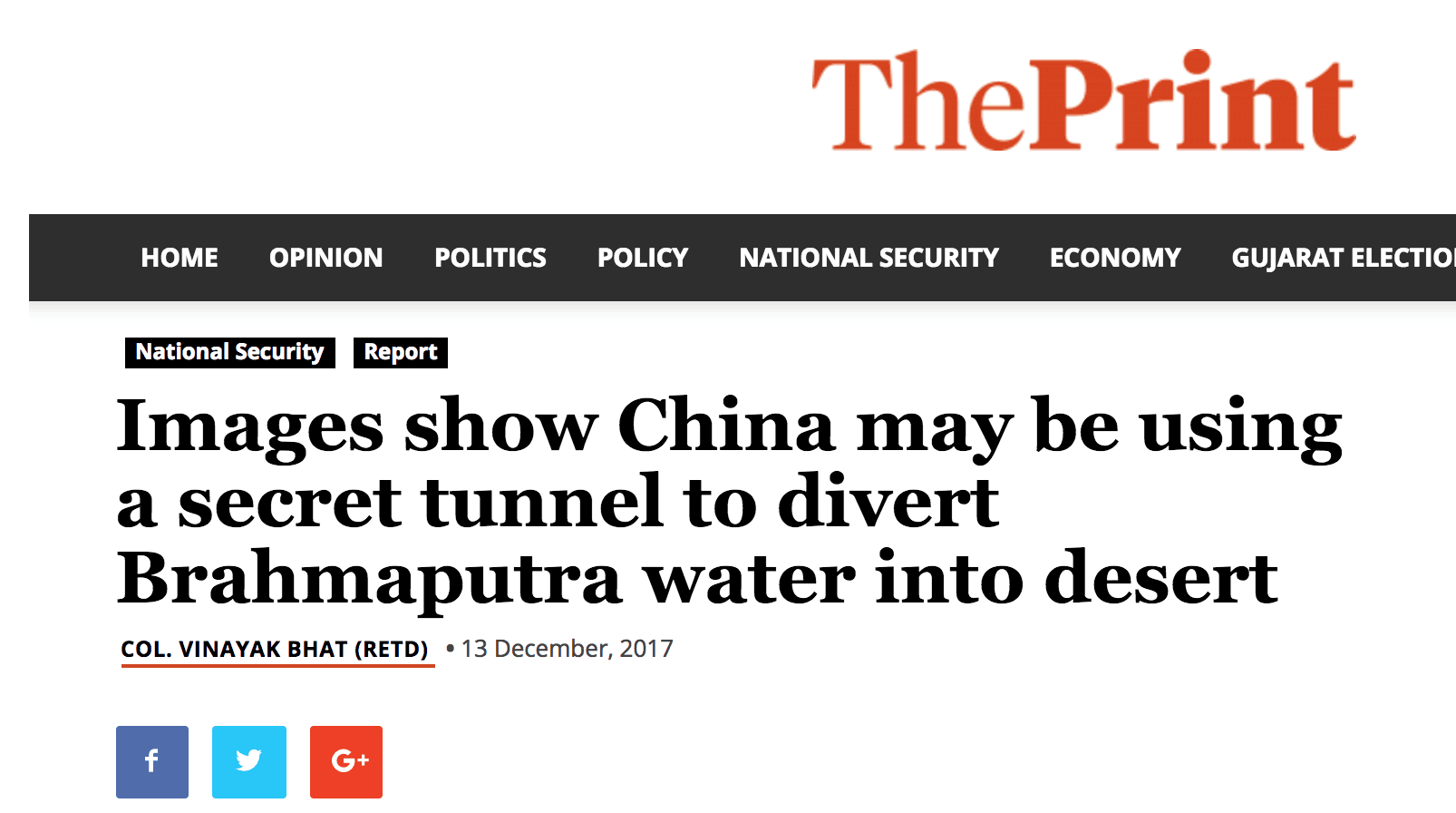 此次向中國發起挑戰的是印度媒體ThePrint,該媒體發表題為“中國或正用秘密隧道將布拉馬普特拉河的河水引入沙漠”的報道,將近期的衞星圖像作為一項“首次發現的證據”稱,中國或許正在進行一項引水工程,在布拉馬普特拉河上新建了一個大規模水壩,下面是一條地下隧道,吞入了一公里的全部水流,讓“布拉馬普特拉河消失在中國900米深的地下隧道里”。