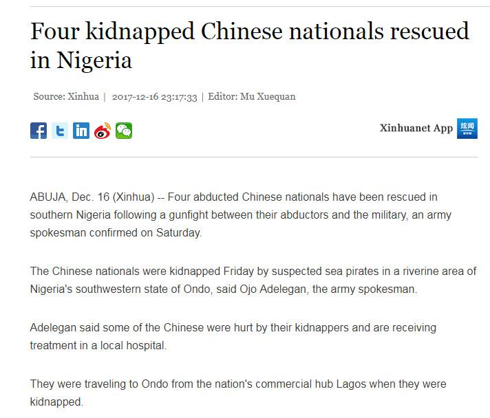 目前四名中國公民的身體狀況還不得而知,尼日利亞軍方也暫未透露關於中方人員的其他消息。