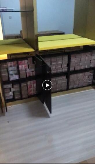 六秒短視頻中顯示,在一個房間內,壁櫃門打開,裏面都是成捆的人民幣;在房間地上落着15個大大的紙盒箱子,其中一個被打開,裏面也全是成捆人民幣。
