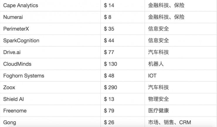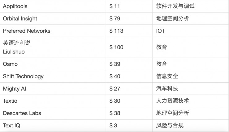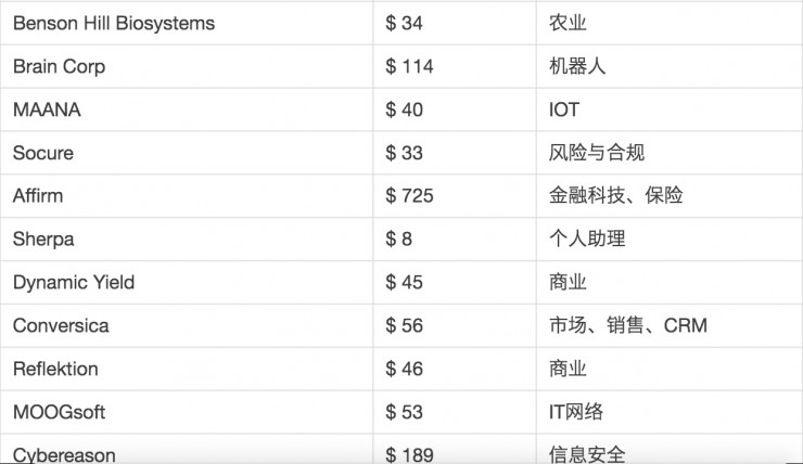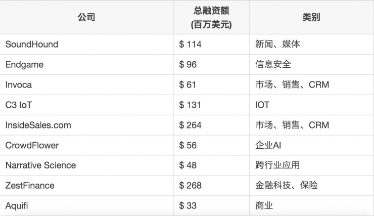 上榜的這些公司都處在於不同的輪次,從種子、天使(如Mobalytics、Text IQ、Merlon Intelligence)到E+輪(如Affirm, C3IoT, 和 InsideSales)都有所涵蓋。