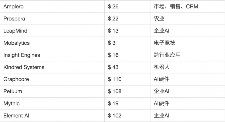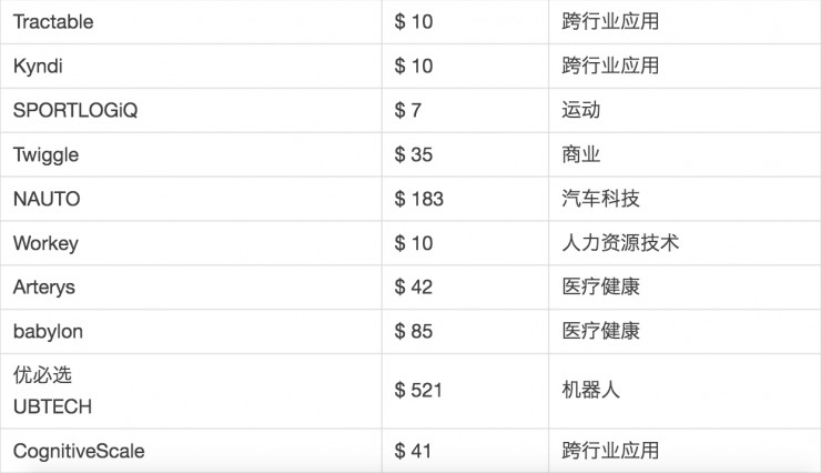 - Element AI,由Yoshua Bengio聯合創辦,深度學習領域先驅公司之一,該公司在2017年第二季度獲得了1.02億美金投資,由 Intel Capital、Microsoft Ventures、NVIDIA GPU Ventures、Real Ventures, 以及騰訊控股( Tencent Holdings)投資。
