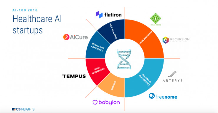 主要公司類別:**醫療領域隨着圖像、診斷、虛擬助手、遠程監控、住院護理等應用落地,在人工智能醫療領域,每個季度都會出現新的公司。在AI100公司裏,有8家公司正在為醫療保健行業開發人工智能解決方案。