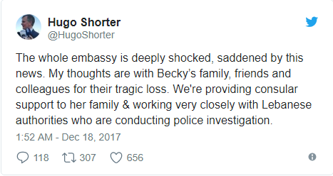 英國駐黎巴嫩大使肖特(Hugo Shorter)在其推特上表示,使館對(戴克斯被殺害)這一消息“深感震驚”和“悲傷”。(編譯/海外網 張敏)