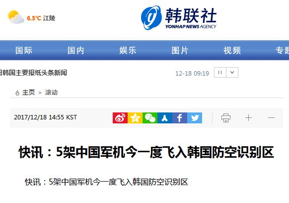 【環球網綜合報道】韓聯社12月18日突然發佈消息稱,5架中國軍機今天一度飛入韓國“防空識別區”。