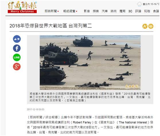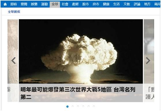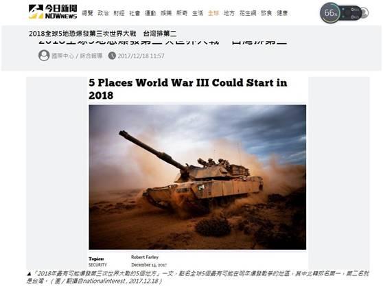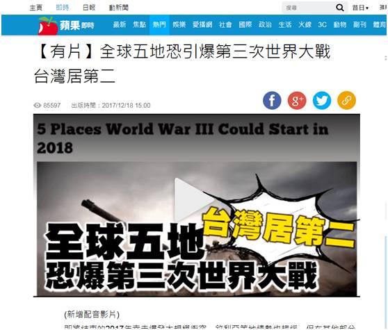 18日,島內“綠皮綠骨”的三立新聞網刊登報道,大呼“塊陶啊!台灣可能發生世界大戰”。