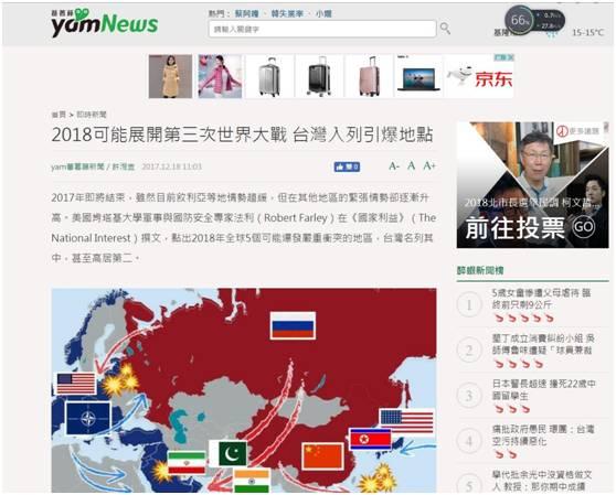 美國肯塔基大學學者羅伯特•法利15日在美國《國家利益》上發表了一篇文章,標題為*“2018年最有可能引發第三次世界大戰的5個地區”*。其中,朝鮮排在首位,台灣緊隨其後,接下來分別是烏克蘭、北約的南方盟國以及波斯灣。