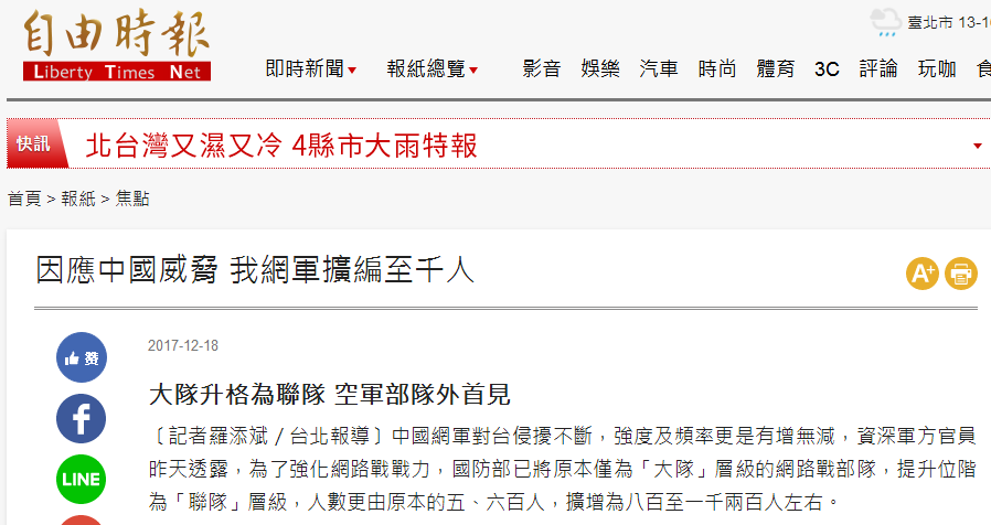 台親綠媒體《自由時報》18日用“因應中國威脅”為題,報道台軍方官員的上述説法,更是妄稱大陸網軍對台“侵擾不斷,強度及頻率更是有增無減”。