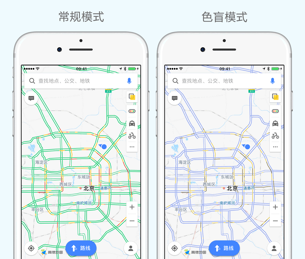 作為國內領先的手機地圖公司,高德積極響應政府的號召,在手機軟件的信息無障礙訪問設計方面始終走在行業前列,同時也是國內第一家專門為視覺障礙人士開發“色盲模式”,以方便視覺障礙人士瞭解即時路況信息的地圖公司。