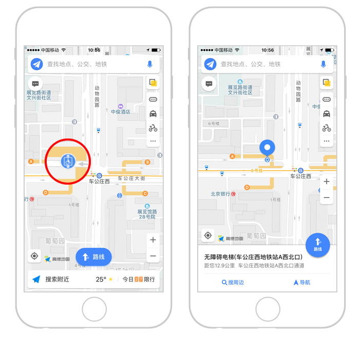 從此之後,在手機地圖上查找無障礙電梯變得很輕鬆。打開手機地圖,找到附近的地鐵站,然後縮放地圖,就可以找到無障礙電梯的圖標,點擊該圖標,就可以進行路線規劃。