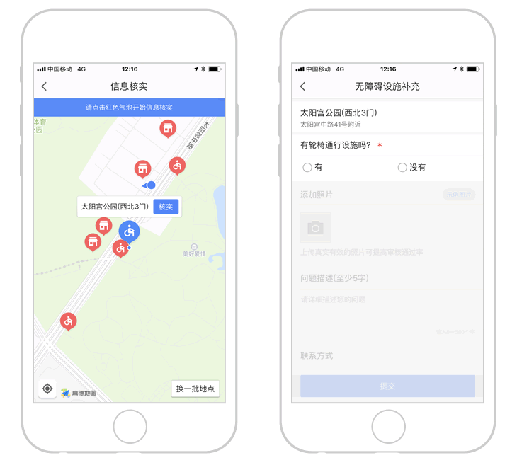 於是,他們在新的軟件版本的“地點貢獻”功能中,設計了上報無障礙設施的模塊,允許用户隨手拍上報自己身邊公園等公共場所的無障礙出入口等設施。