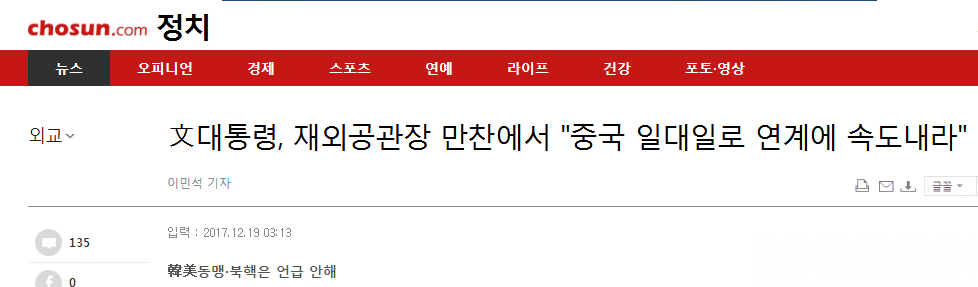 報道稱,繼本次訪華後,文在寅再次強調了加盟中方“一帶一路”倡議的事宜。同時,文在寅在當天約21頁的演講稿中,並未提及“韓美同盟”、“美國”、“朝核”等內容。韓國經濟副總理金東兗、外交部長康京和以及國防部長宋永武以及新任大使等182名駐外公館負責人出席了當天的晚宴。