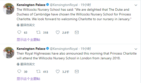 肯辛頓宮隨後也公佈,夏洛特公主明年1月將開始上幼兒園,王室選擇的是位於肯辛頓宮附近的魏考克斯幼兒園(Willcocks Nursery School)。