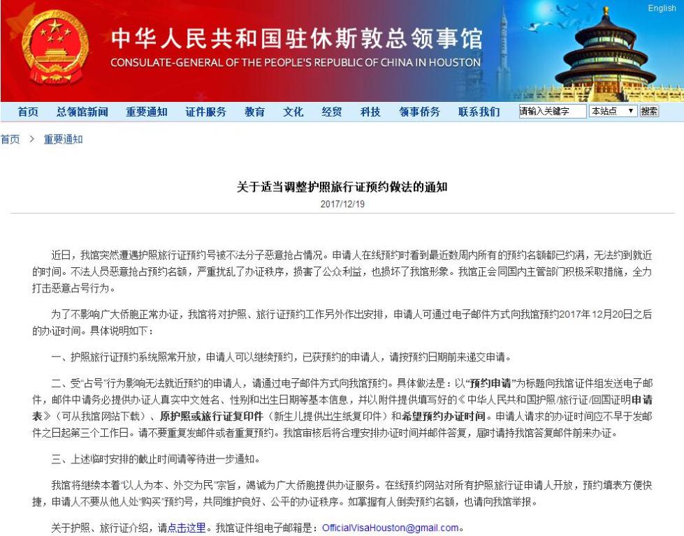 為了不影響廣大僑胞正常辦證,駐休斯敦總領館將對護照、旅行證預約工作另外作出安排,申請人可通過電子郵件方式向該館預約2017年12月20日之後的辦證時間。具體説明如下: