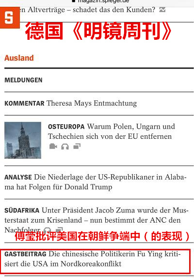 【環球網綜合報道】全國人大常委會委員、全國人大外事委員會主任委員傅瑩12月16日在德國媒體《明鏡週刊》(Der Spiegel)上撰文,批評美國激化朝鮮半島的局勢。同時,傅瑩也強調稱,和平的窗户還沒關上,各方努力的目標應該是建立一套機制,讓區域內每個國家的安全都得到保證。