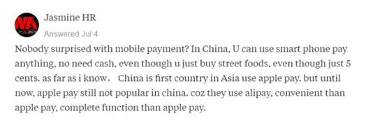網友Jasmine HR:沒人對移動支付感到震驚嗎?在中國,你只要有手機就能買任何東西,完全不用現金,就算是買路邊攤,就算只是要付半毛錢都能用手機。中國是亞洲最早開通蘋果支付的國家,然而蘋果支付在中國還是沒普及。因為中國的支付寶實在是太方便了,功能還比蘋果支付強大。