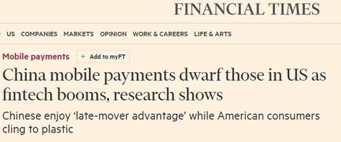 今年2月,英國的《金融時報》發表了一篇題為《相比於中國,美國的移動支付市場看上去像是侏儒》的文章。Forrester在其報告中這樣描述美國的支付情景:“陳舊的習慣很難就此消失,在結賬櫃枱前,人們還是更願意拿出信用卡支付,而不是拿出手機來掃一掃。”
