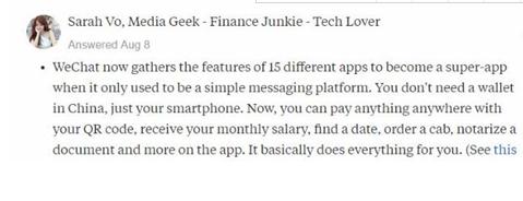 網友:微信雖然是通訊應用起步,但現在已經將15款應用的功能集於一身,十分強大。在中國你完全不需要錢包,有手機就夠了。只要掃碼就能隨時隨地買到任何東西,你可以查工資、交友、叫車、傳文件,什麼都能做。