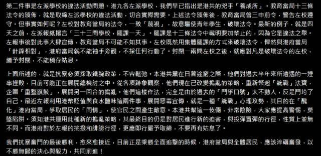 更棘手的是,由於現在學校都是面向社會招生和招聘教師的,所以如今香港社會中的那些極端思想,甚至也開始侵入“港專”這種傳統“愛國愛港”學校。去年和今年“港專”的畢業典禮上連續出現對國歌不尊敬的行為,就令人感到一絲憂慮。